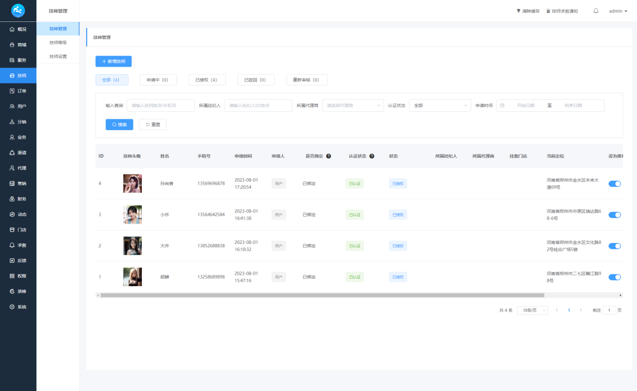 27、后台新增:技师统计(技师概况、技师数据统计、区域分布、技师数据等,可视化数据一目了然)