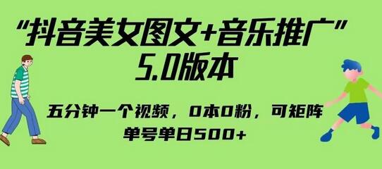 抖音美女图文+音乐推广5.0版本,单日单号500+,0本0粉可矩阵,五分钟一个视频