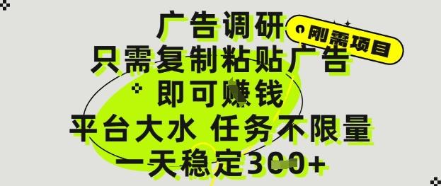 广告调研项目,只需复制粘贴广告即可挣钱,平台大水,任务不限量,一天3张【揭秘】