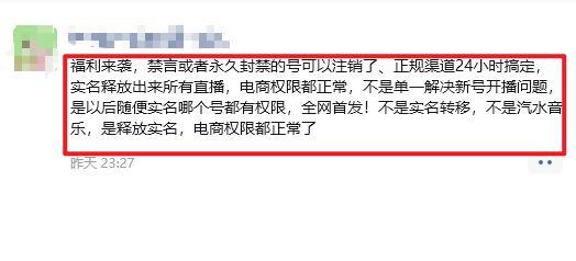 禁言或者永久封禁的号可以注销了、正规渠道24小时搞定,十名释放出来所有直播,电商权限都正常,不是单一解决新号开播问题,是以后随便十名哪个号都有权限,全网首发!