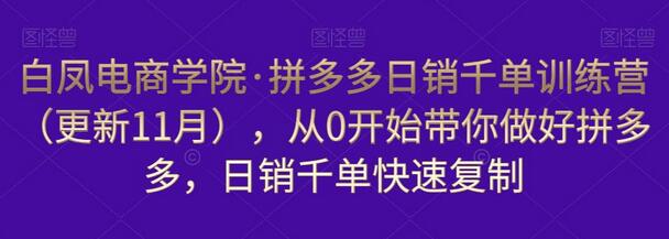 课程来自白凤电商学院的拼多多日销千单训练营(更新11月),价值5000元。从0开始带你做好拼多多,让日销千单可以快速复制,一对一带店实训,快速打造日销千单店铺。