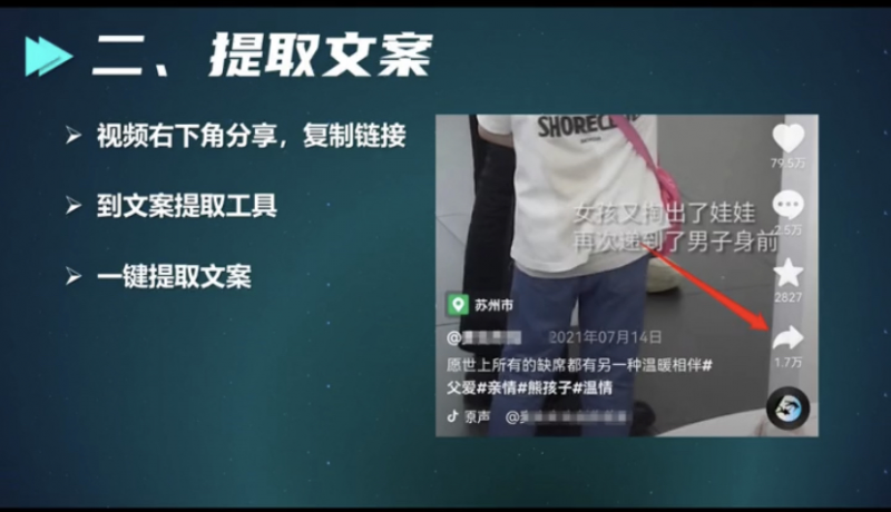 这个视频里边的文案就被我们提取出来了,但是这里边需要注意这个文案提取出来之后,一定不要直接用,我们把这冒泡网赚个文案通篇的读一遍,然后根据自己的理解用自己的嘴巴把这个温情故事再给讲一遍,这样就不会有违规的风险。