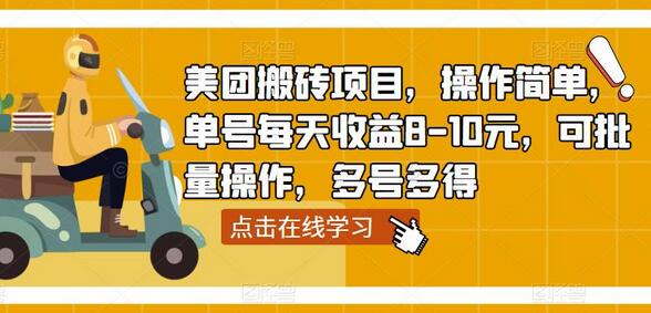 美团搬砖项目,操作简单,单号每天收益8-10元,可批量操作,多号多得