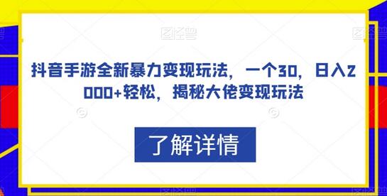 今天给大家带来的项目是《抖音手游全新暴力变现玩法,一个30,日入2000+轻松,揭秘大佬变现玩法》