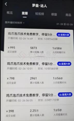 2月26号,问他收益是多少,2月26号两小时卖了2,000,2月26号10:01播了1小时58分卖了798,2月26号早上6;00播了两个小时多卖了390,加起来就已经有2,000块钱了,2,000块钱他拿70%剩下30%给他那个老师,他大概能达到1,400。