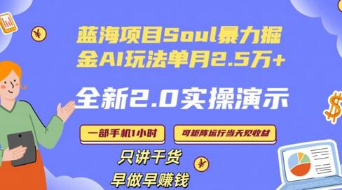 Soul2.0AI掘金玩法月入2万5千+一部手机小白当天就能上手项目简介:今天给大家带来的是2024年SoulAI掘金项目,月入25000+真正的蓝海赛道,秒杀同类别项目,