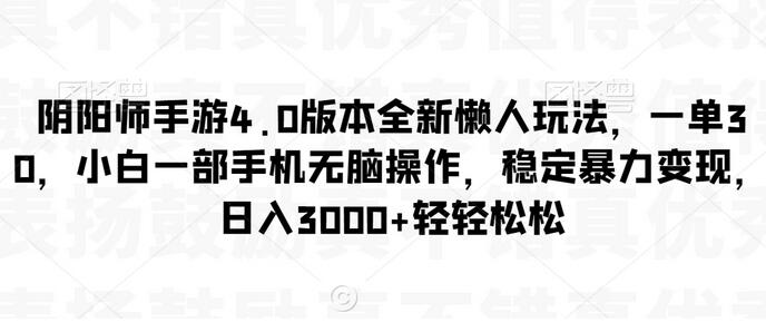 阴阳师手游4.0版本全新懒人玩法,一单30,小白一部手机无脑操作,稳定暴力变现