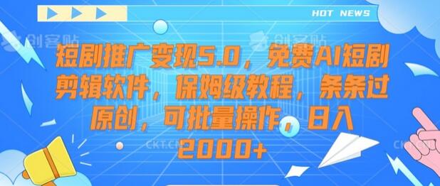 短剧推广变现5.0,免费AI短剧剪辑软件,保姆级教程,条条过原创,可批量操作,日入2000+