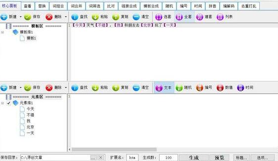 核心功能:编写模板,模板中引用元素,任意位置引用任意个元素。元素可以是文本分块调用,可以是随机汉字、数字、字母,或编号序列、随机数值、随机时间。全自由原创组合模式。