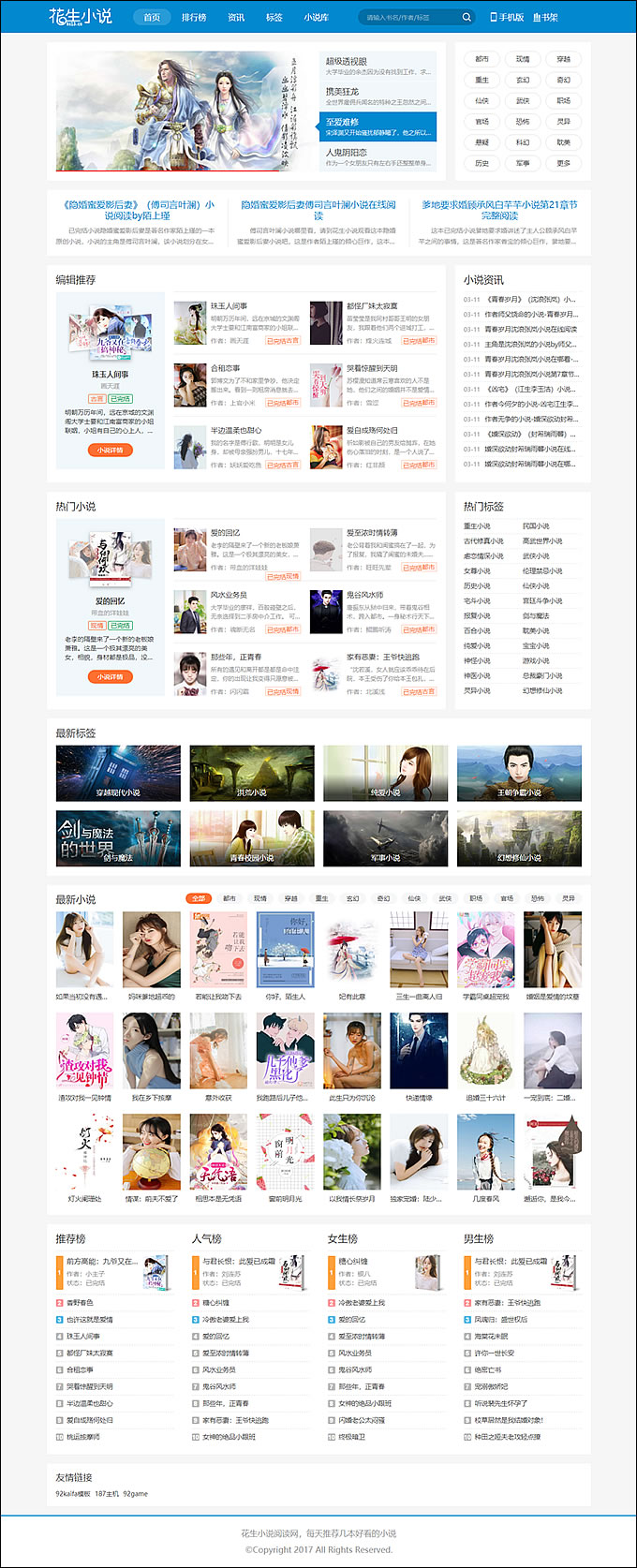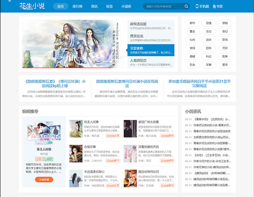 帝国cms7.5仿花生小说蓝色小说网站导航引流网站源码 带手机版 一个专注小说阅读细化分类的网站。