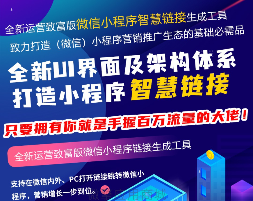 只要拥有你就是手握百万流量的大佬,全新运营致富版微信小程序链接生成工具,支持在微信内外、PC打开链接跳转微信小程序,营销增长步到位。