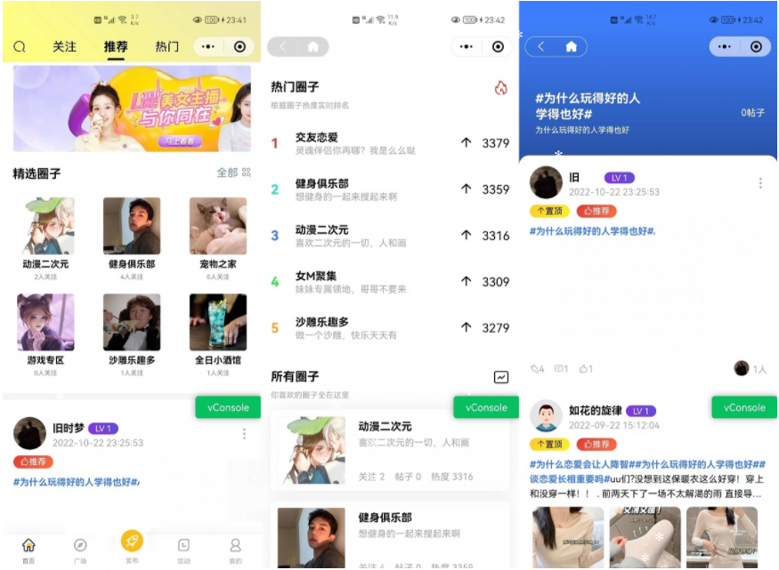 功能:小程序授权登陆,H5和APP,手机号登陆,发帖,建圈子、发活动。